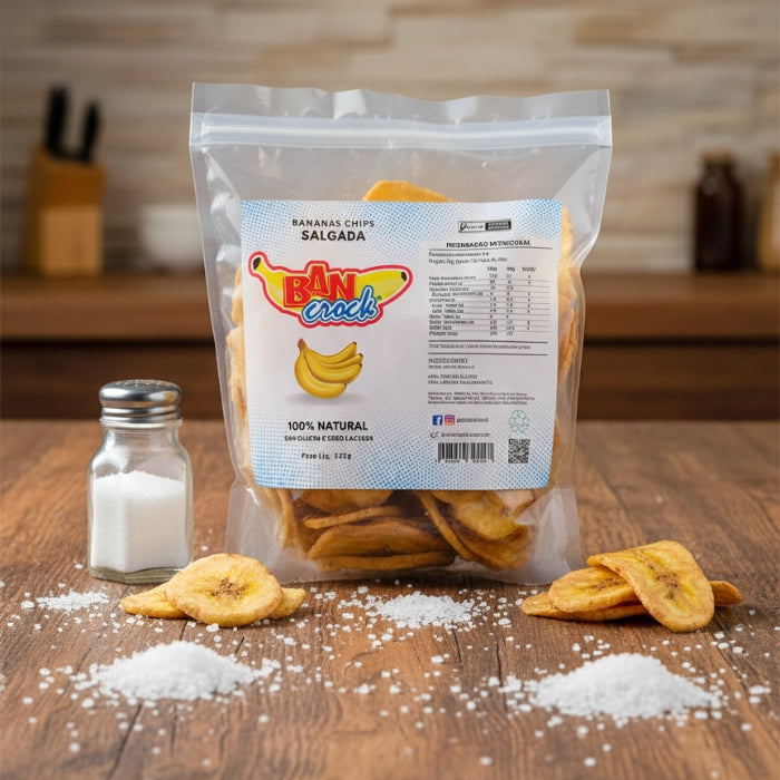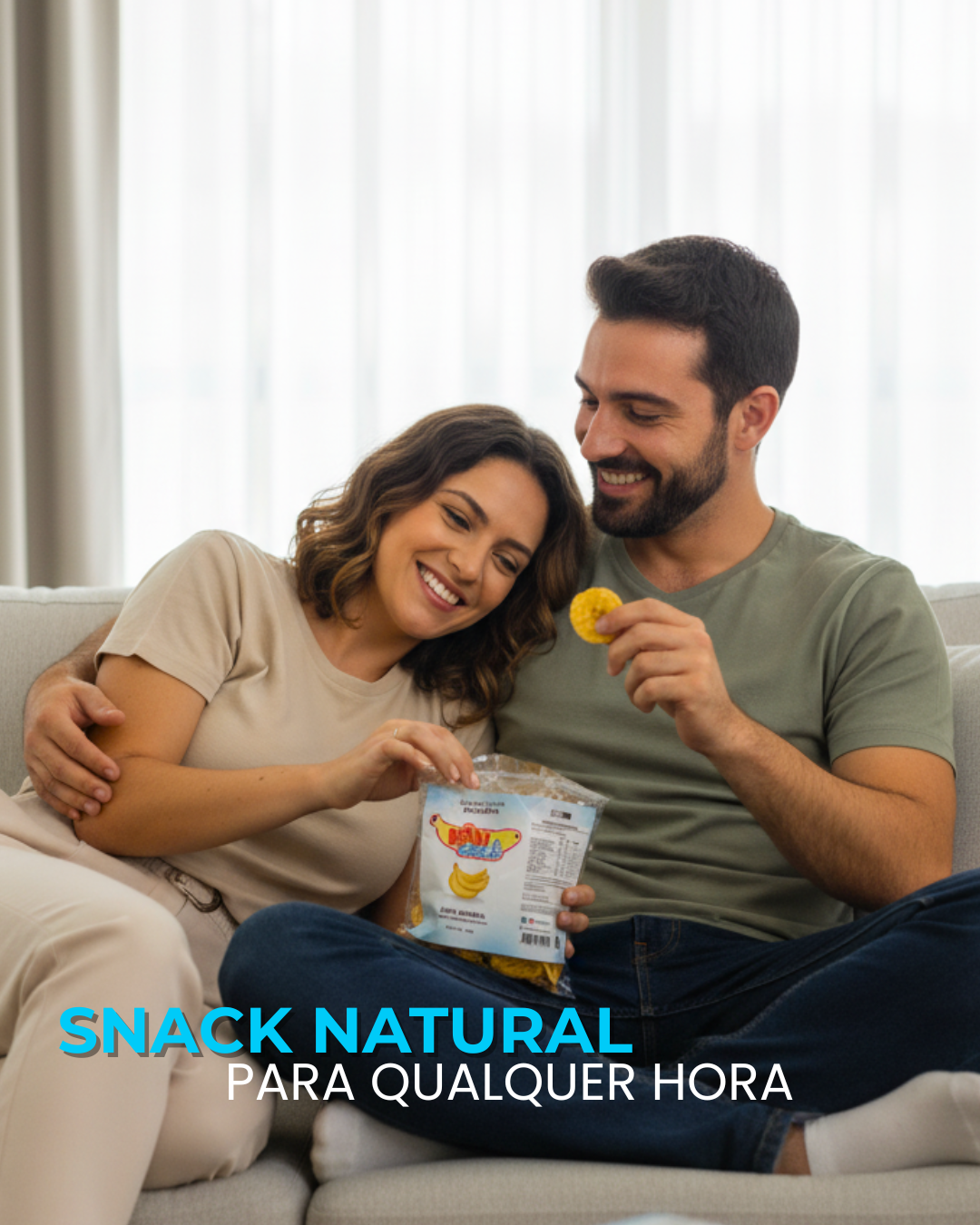 Crocante, saudável e prática. Feitas com bananas selecionadas e um toque de sal, sem glúten, lactose, conservantes ou gorduras trans. Perfeitas para lanches rápidos, pós-treino ou como acompanhamento leve, combinam o doce da banana com o sal em um sabor irresistível.