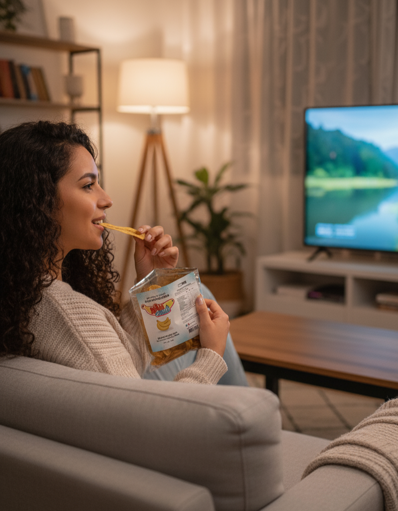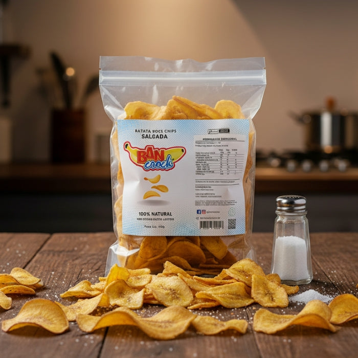 Crocante, saudável e prática. Feitas com bananas selecionadas e um toque de sal, sem glúten, lactose, conservantes ou gorduras trans. Perfeitas para lanches rápidos, pós-treino ou como acompanhamento leve, combinam o doce da banana com o sal em um sabor irresistível.